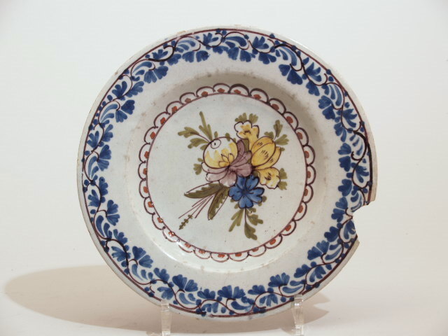 Bord waarvan het plat polychroom is versierd met een boeket en de rand met een rankendecor in blauw en mangaan. (Q14325)