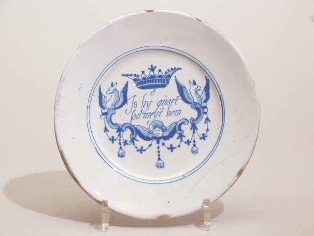 Pannenkoek, op het plat in blauw gedecoreerd met de spreuk: 'Is hy qùaet soo meyt hem' in een medaillon met bovenaan een kroon, aan weerszijden een gevleugeld vosje en onderaan een engelenkopje (Nederlands)