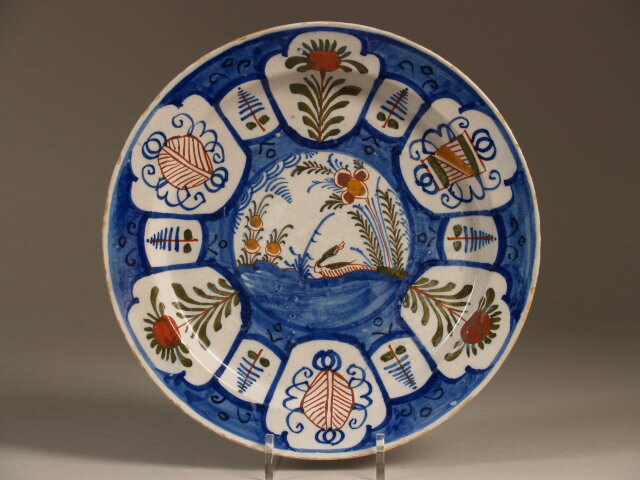 Bord, polychroom gedecoreerd op een grijswit glazuur, op het plat versierd met een oeverlandschap met eend. De rand is versierd met zes grote en zes kleine vakken met daarin plantmotieven. (Nederlands)