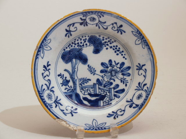 Bord, in blauw gedecoreerd op een wit glazuur, met op het plat de voorstelling van een tuin met hekje, boom en bloemen. De rand is gedecoreerd met bloemenranken en de lip is geel.