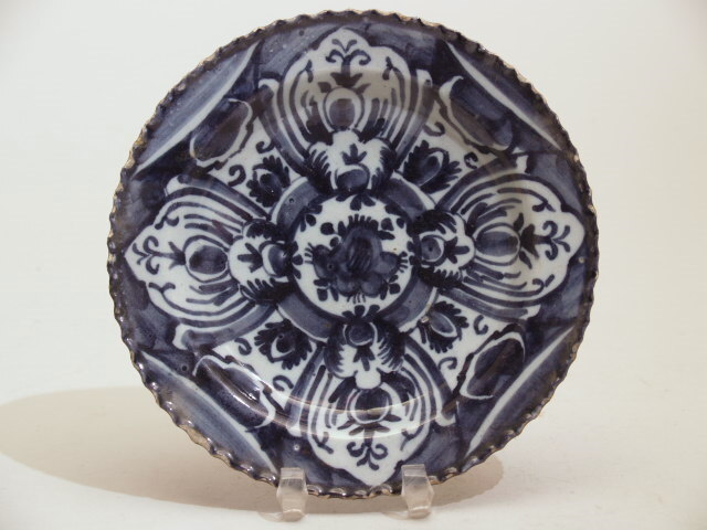 | Nederlands | Bord, in blauw gedecoreerd op een wit glazuur. Centraal op het plat een bloemmotief, daar omheen gedecoreerd met een gestilleerd floraal motief. |