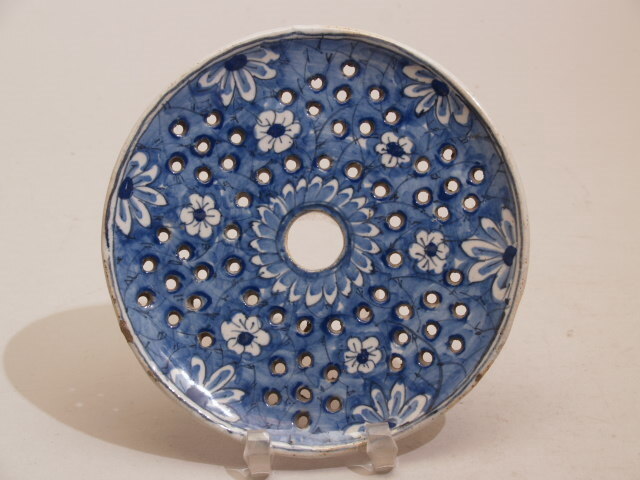 Treeft, in blauw gedecoreerd op een cremewit glazuur met decor van bloemen tegen een cracked ice achtergrond.