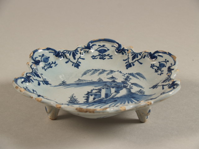 Schaal met gegolfde rand op drie spreidende pootjes, in blauw gedecoreerd op een blauwig wit glazuur met centraal de voorstelling van een kasteel met bomen en water. De gegolfde rand is versierd met een bladmotief. (Q14354)