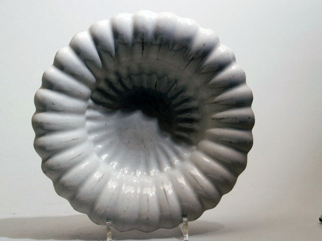 Plooischotel van rozig aardewerk met een romig wit glazuur. De wand bestaat uit 28 lobben in twee zones: eerst verjongend daarna spreidend.