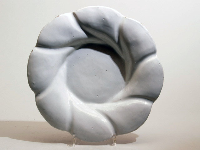 Plooischotel van geelgrijs aardewerk met een wit glazuur. De wand is eerst horizontaal en daarna in acht gedraaide lobben die licht bol verjongen.