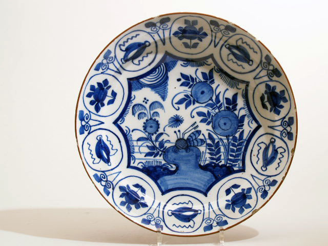 | Nederlands | Ronde schotel, in blauw gedecoreerd op een grijswit glazuur. Het plat is beschilderd met een oeverlanschap en de rand met een versiering in tien vakken met afwisselend een bloem en een vis (?). |