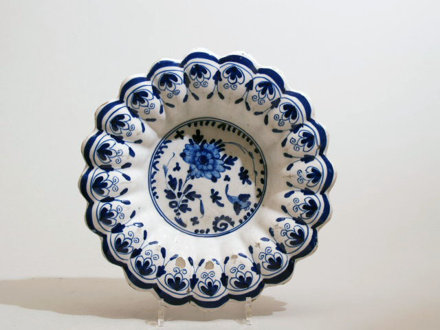 Plooischotel, in twee kleuren blauw gedecoreerd op een wit glazuur met centraal een voorstellng van bloemen. De gelobde rand is gedecoreerd met een geabstraheerd floraal patroon.