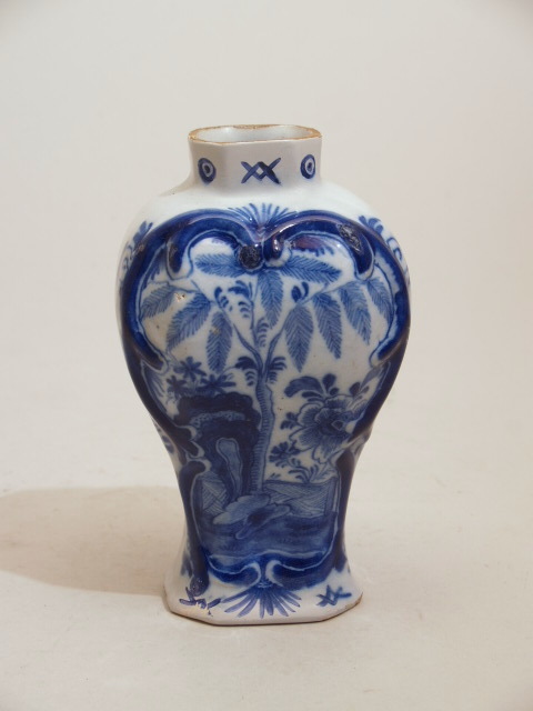 Balustervormige vaas, in blauw gedecoreerd op een grijswit glazuur met de voorstelling van een 'tuintje' in een cartouche in rococostijl. (Nederlands)