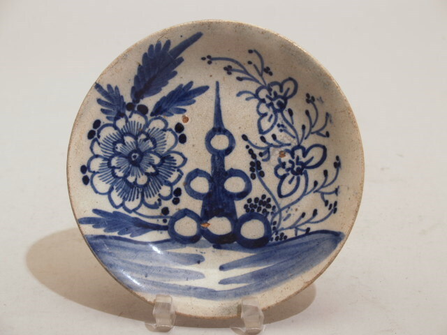 | Nederlands | Bord, in blauw gedecoreerd op een wit glazuur met centraal een toren en daarnaast twee bloemmotieven. |