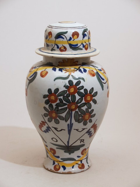 Balustervormige dekselpot, polychroom versierd op een witglazuur met centraal een oranjeboom en verder motieven waarin oranjeappeltjes zijn verwerkt.