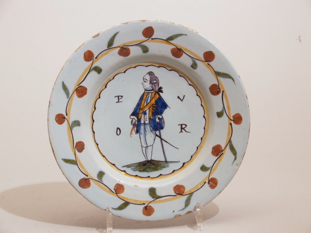 Bord met polychroom oranjedecor, in de kleuren groen, blauw, geel, mangaan en oranje. Op het plat is een oranjeprins ten voeten uit geschilderd, met aan weerszijden de letters 'PVOR'. De rand is versierd met een slingerend decor van oranjeappels. (Nederlands)