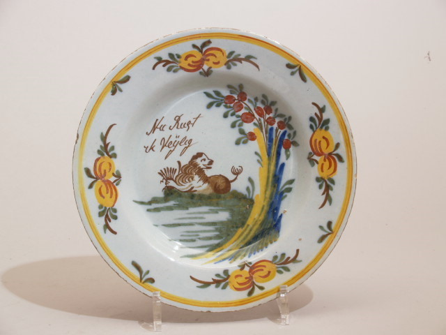 Bord met een polychroom decor, op het plat beschilderd met een op gras liggende leeuw met zwaard en pijlenbundel onder een oranjeboom met daarbij de tekst: 'Nu Rust ik veijlig'. De rand is gedecoreerd met vier oranjeappeltjes en een gele bies. (Nederlands)