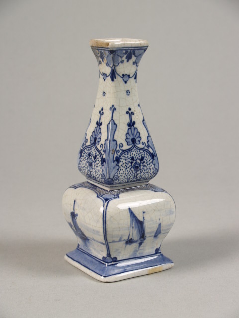 | Nederlands | Vaas met een landschappelijk decor van molens en schepen in blauw op wit. |