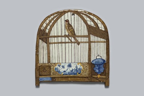 Plaat in de vorm van een vogelkooi met polychroom decor van vogel in kooi, onder in een cartouche een waterlandschap in blauw-wit.||200020625 |