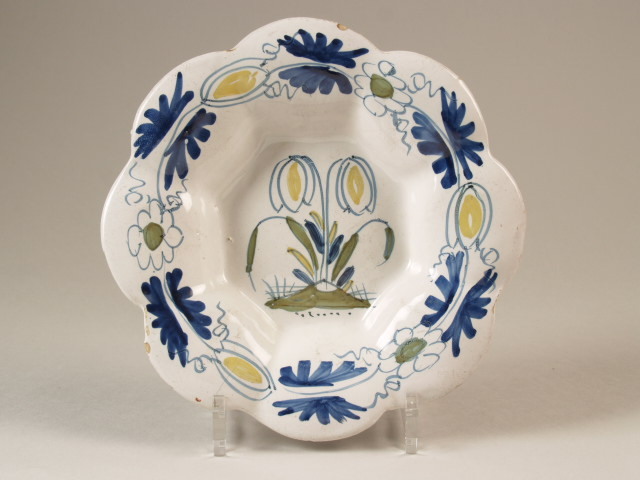 | Nederlands | Plooischotel, polychroom gedecoreerd op een wit glazuur met op het plat twee gespiegelde tulpen in de grond. De rand is gedecoreerd met een floraal patroon met op ieder van de acht lobben een bloem/ bladbeschildering. |