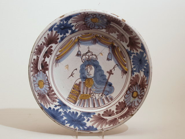 | Nederlands | Schotel, polychroom versierd op een wit glazuur met op het plat de beeltenis van een vorst met scepter en koningskroon (Koning-Stadhouder Willem III?), de rand is versierd met een floraal motief. |