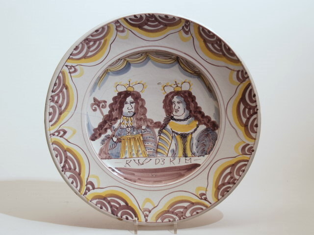 Schotel, polychroom versierd op een wit glazuur met op het plat de beeltenissen van Koning-Stadhouder Willem III en Mary Stuart met koningskronen, de rand is versierd in mangaan en geel. (Nederlands)