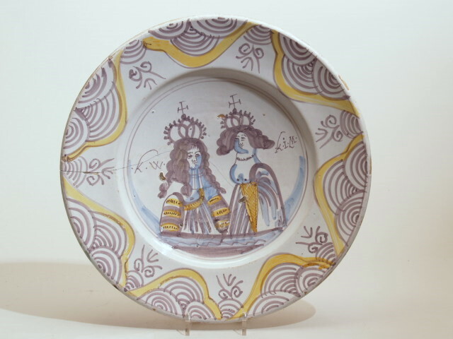 Schotel, polychroom versierd op een wit glazuur met op het plat de beeltenissen van Koning-Stadhouder Willem III en Mary Stuart met koningskronen, de rand is versierd in mangaan en geel. (Nederlands)