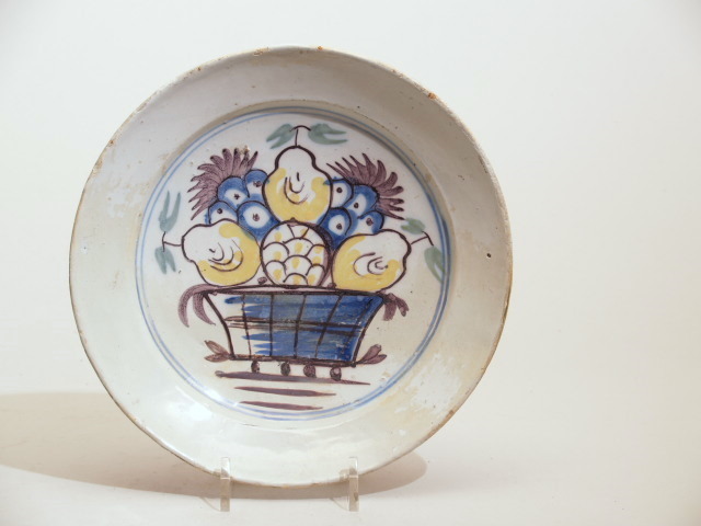 Bord, polychroom versierd op een wit glazuur met op het plat de voorstelling van een vruchtenmand afgezet door een dubbele smalle blauwe bies. (Q14532)