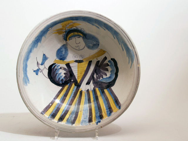 Schotel met een wit fond met daarop een polychrome beschildering van een vrouwfiguur met een wijnglas in de linker hand.
