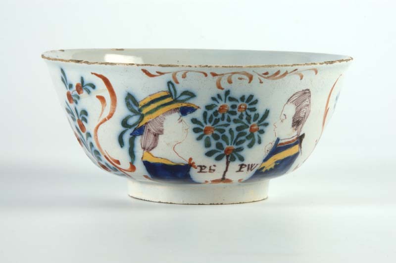 Kom met de portretten van Prins Willem V en zijn vrouw ter weerszijden van een oranjeboom en de letters PS PW. Verder bloemversiering. Polychroom beschilderd.