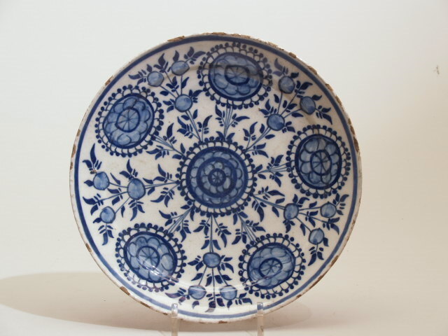 Pannekoek, in blauw gedecoreerd op een wit glazuur. Het gehele bord is met een repetitief patroon van chrysanten en vruchten.