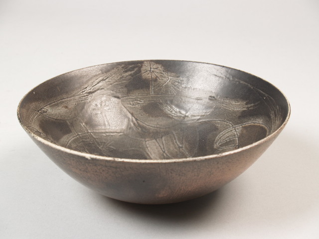 | Nederlands | Kom op heel lage voet. Aan buitenzijde in tinten bruin, beige, groen geglazuurd aan binnenzijde zwart/groene engobe met ingegrift decor van figuren en cirkelvormen (engel met vogels?) |