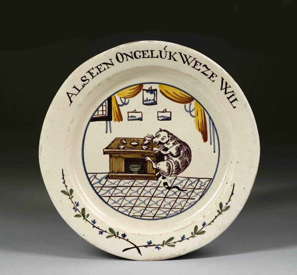 Bord waarvan het plat polychroom is gedecoreerd met een interieur met centraal een kat bij een tafel. Op de rand van het bord is aan de bovenzijde de tekst geschilderd: 'ALS EEN ONGELUK WEZE WIL' en aan de onderzijde een motief van een tak met bladeren. (Nederlands)