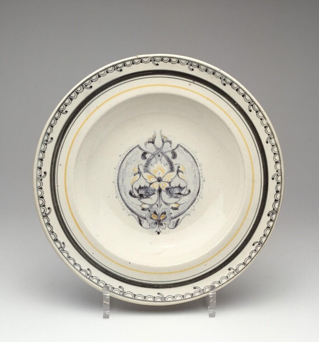 Verdiept bord, op het plat gedecoreerd met een bloemmotief en met een doorlopende band en schubben op de platte rand. (Nederlands)
