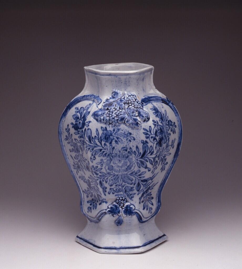 Zeskantig en enigszins platte vaas met in cartouche een forse bloem met takjes, het zogenoemde 'Tulk-zonnebloemmotief'. Aan de boven- en onderzijde een druiventros in reliëf. (Nederlands)