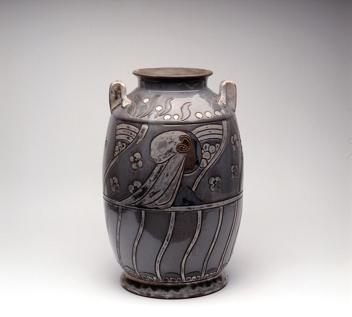 Hoge vaas met toelopende schouder waarop twee opstaande oren, korte hals en uitbuigende liprand. Ingekraste decoratie van een vrouwenkopje met een Hollandse hoofdtooi, florale en lineaire motieven in grijs, groen, wit en beige Relflet Metallique. (Nederlands)