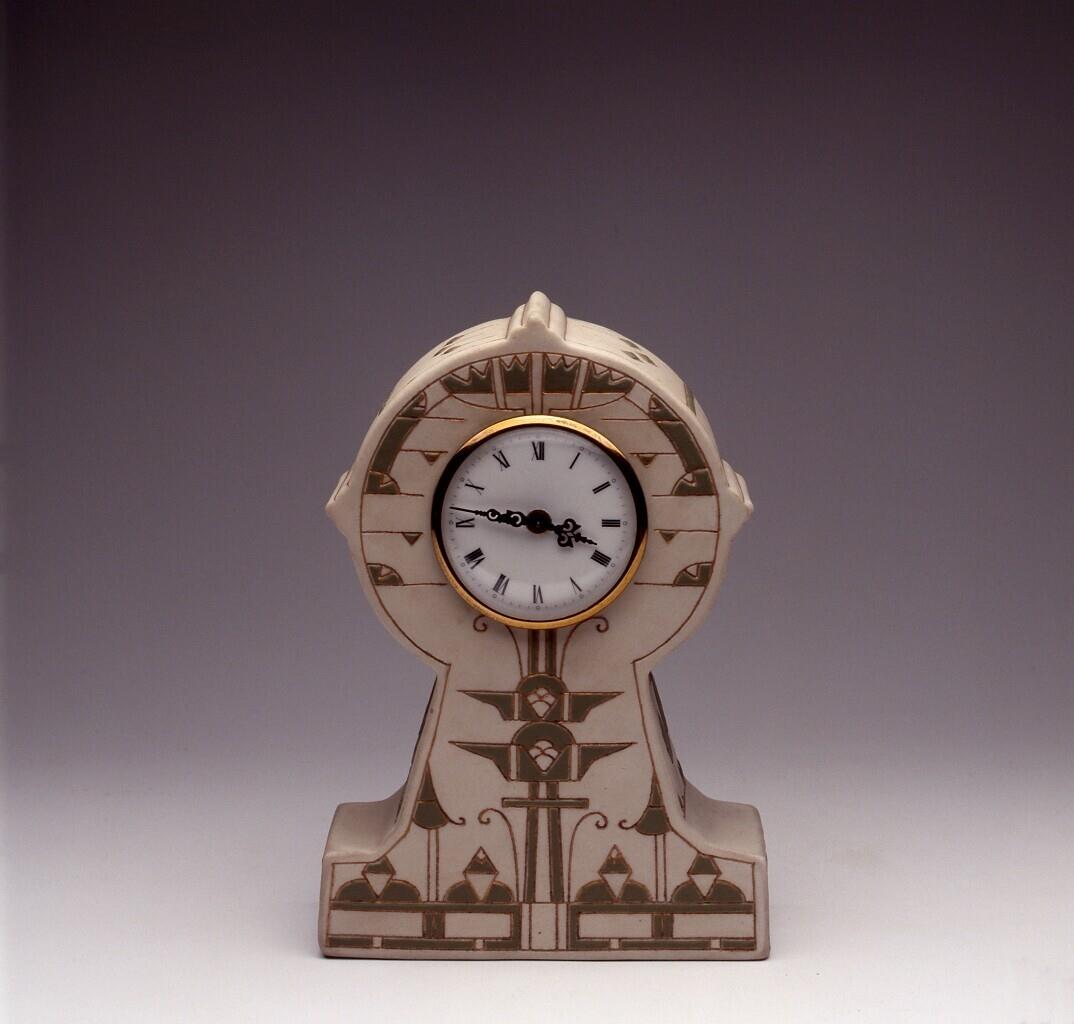 De pendule is samengesteld uit een ronde klokkast op een uitlopende voet en een rechthoekig sokkel met afgeplatte voor- en achterkant. Het geheel is versierd met een ingegrifte symmetrisch aangebrachte decoratie van onder meer hanen en geometrische figuren. Goud ingekleurde lijnen en groene porseleinslib. (Nederlands)