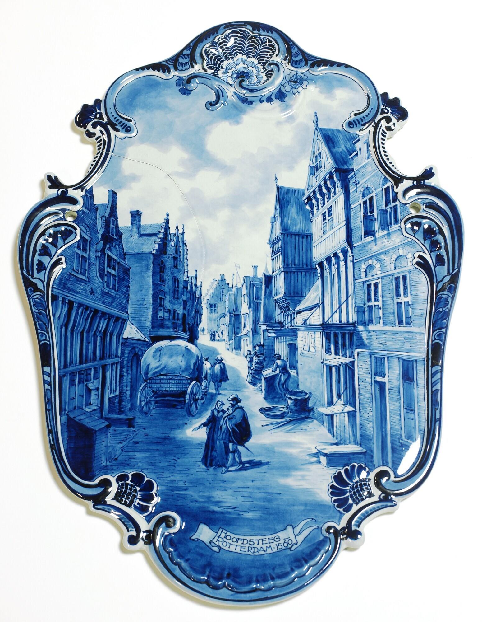 Plaque met een afbeelding, naar een tekening daterend uit circa 1840 (met het niet geïdentificeerde signatuur A.V.R.), van De Mandemakers- of Hoofdsteeg, en opschrift 'Hoofdsteeg Rotterdam 1560'. (Nederlands)
