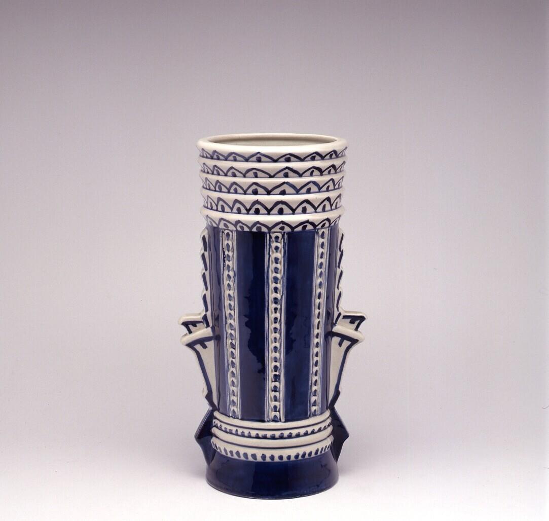 Bekervaas, gedecoreerd in blauw, voorzien van reliëfbanden met zigzaglijnen en stippen. Horizontale banden rondom de bovenrand en de voet met daartussen verticale banden waarvan twee zijn uitgewerkt tot sierhandvatten. (Nederlands)