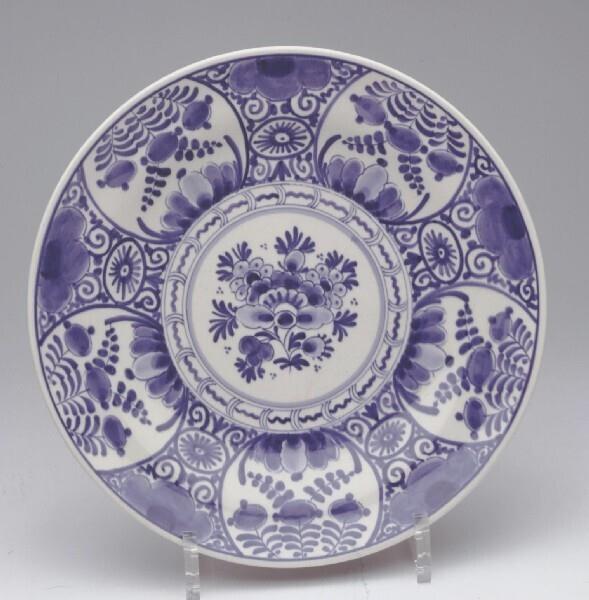 Bord met centraal op het plat een bloementoef, die wordt begrensd door een band met geometrische motieven. Het bord heeft aan de achterkant een standring en twee concentrische cirkels. (Nederlands)