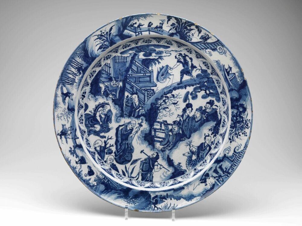 Grote schotel op standring aan de achterkant beschilderd met stippen. Op de voorzijde is een beschildering in blauw-wit van de acht onsterfelijken die is geïnspireerd op dat van Chinees porselein. Deze acht onsterflijken komen voort uit het Taoïsme, een oude Chinese religie. Elk figuur heeft een eigen attribuut en verhaal. De pijprokende monnik die op een tijger rijdt, is een fantasiefiguur die alleen voor komt in chinoiserieën van de westerse wereld. Het randdecor van deze schotel is waarschijnlijk geïnspireerd op dat van verschillende Chinese porseleinen schoteltjes. Het type Chinees porselein dat gekopieerd zal zijn door de Delftse plateelschilder dateert waarschijnlijk uit die van de regeringsperiode van de Chinese keizer Kangxi (1662-1722) (Nederlands)