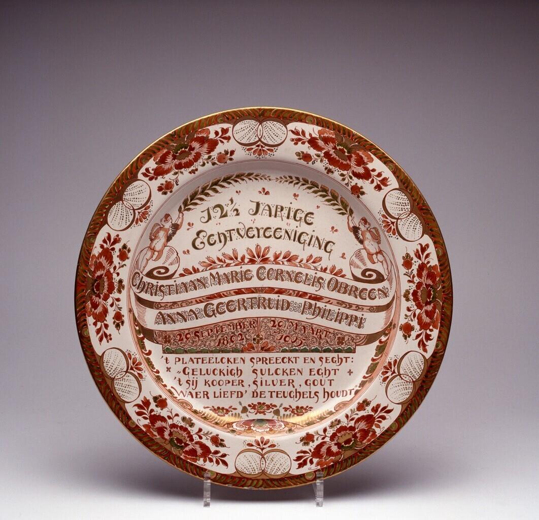 De met standring uitgevoerde huwelijksschotel is aan de achterkant beschilderd met drie concentrische cirkels. De tekst aan de voorzijde, die naar een in 1892 gesloten huwelijk verwijst, wordt omlijst door twee cherubijnen met lauwertakken en gestileerde florale motieven. Op de rand zijn alternerend verstrengelde ringen aangebracht en bloemwerk. Met opschrift: '12 1/2 jarige echtvereeniging Christiaan Marie Cornelis Obreen Anna Geertruid Philippi, 29 september 1892 - 29 maart 1905' en gedicht: ''t Plateelcken spreeckt en seght: / Geluckigh sulcken eght / 't sij kooper, silver, gout / Waer liefd' de teughels houdt'. (Nederlands)