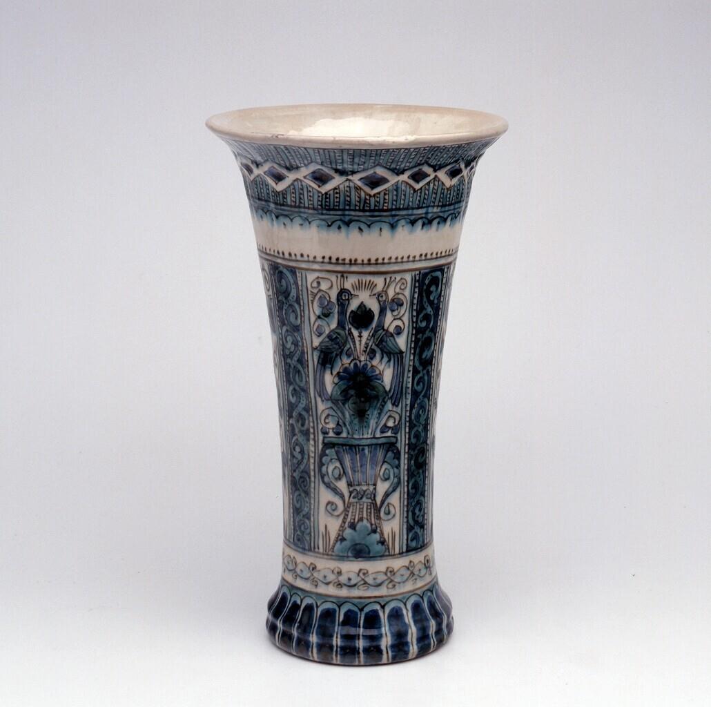 Uitlopende bekervaas, gedecoreerd met banden en vakken waarin bloemvazen en vogels, ranken en geometrische motieven. (Nederlands)