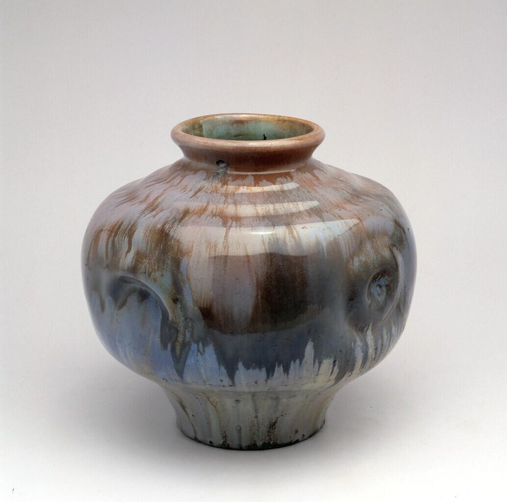 De vaas op een smalle voet heeft een bolle buik met aan de vier zijden cirkelvormige decoraties in reliëf. Op de getrapte schouder is een korte ingesnoerde nek. Metaalglans in overwegend grijs / lichtpaars met vloeisporen zgn 'Katzenauge' of 'Catseye'. (Nederlands)
