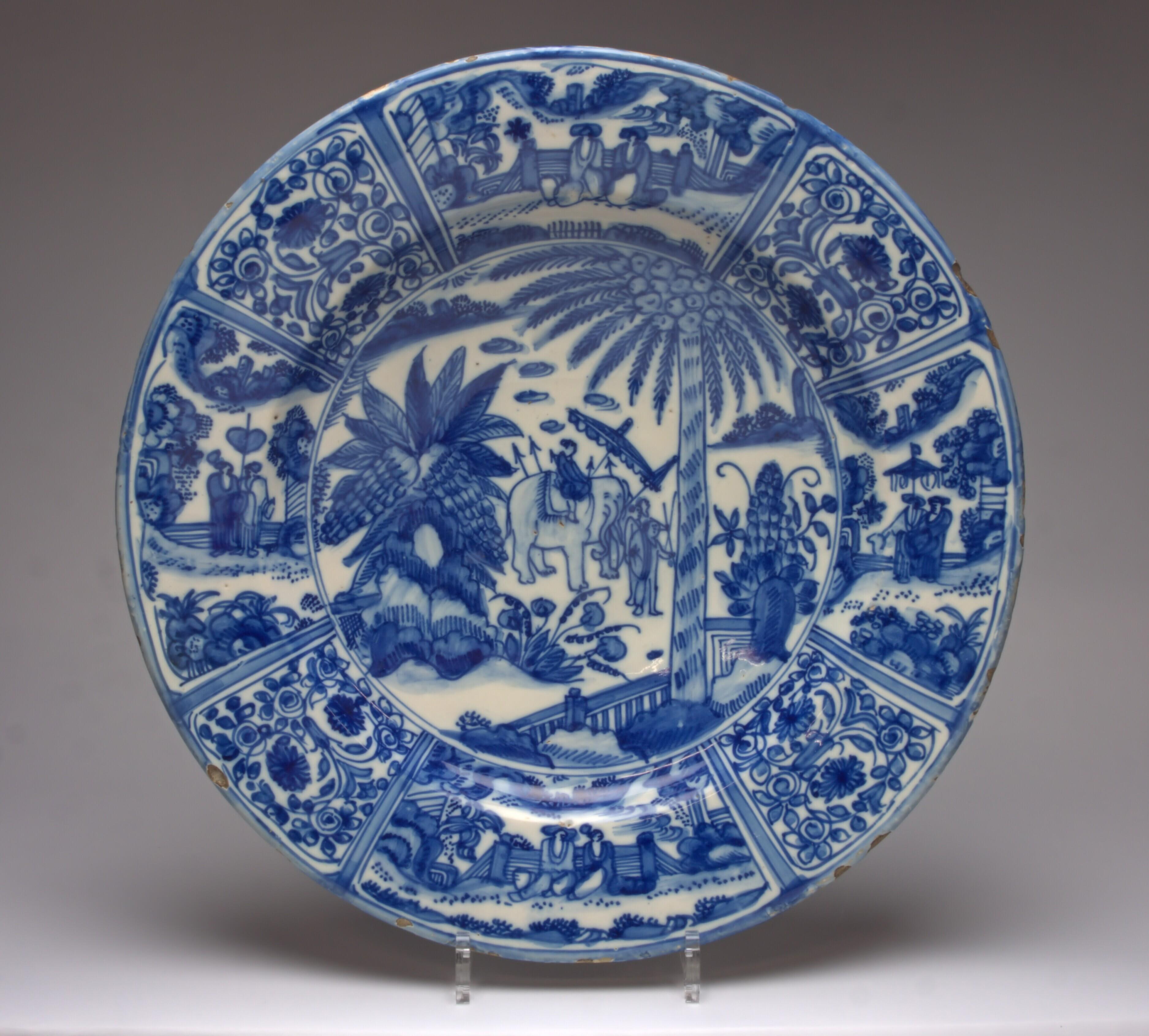 met Wanli-veld verdeling; decoratie imitatie overgangsporselein:in Chinees landschap bij palmboom een vorst gezeten op olifant voorafgegaan door drie lopende dienaren; met opengeklapte en gesloten parasol; in compartimenten 2x twee zittende Chinezen in landschap bij hek; 2x twee staande Chinezen in landschap met bebouwing, het ene stel met waaier, het andere met parasol; andere compartimenten met ranken; (Nederlands)