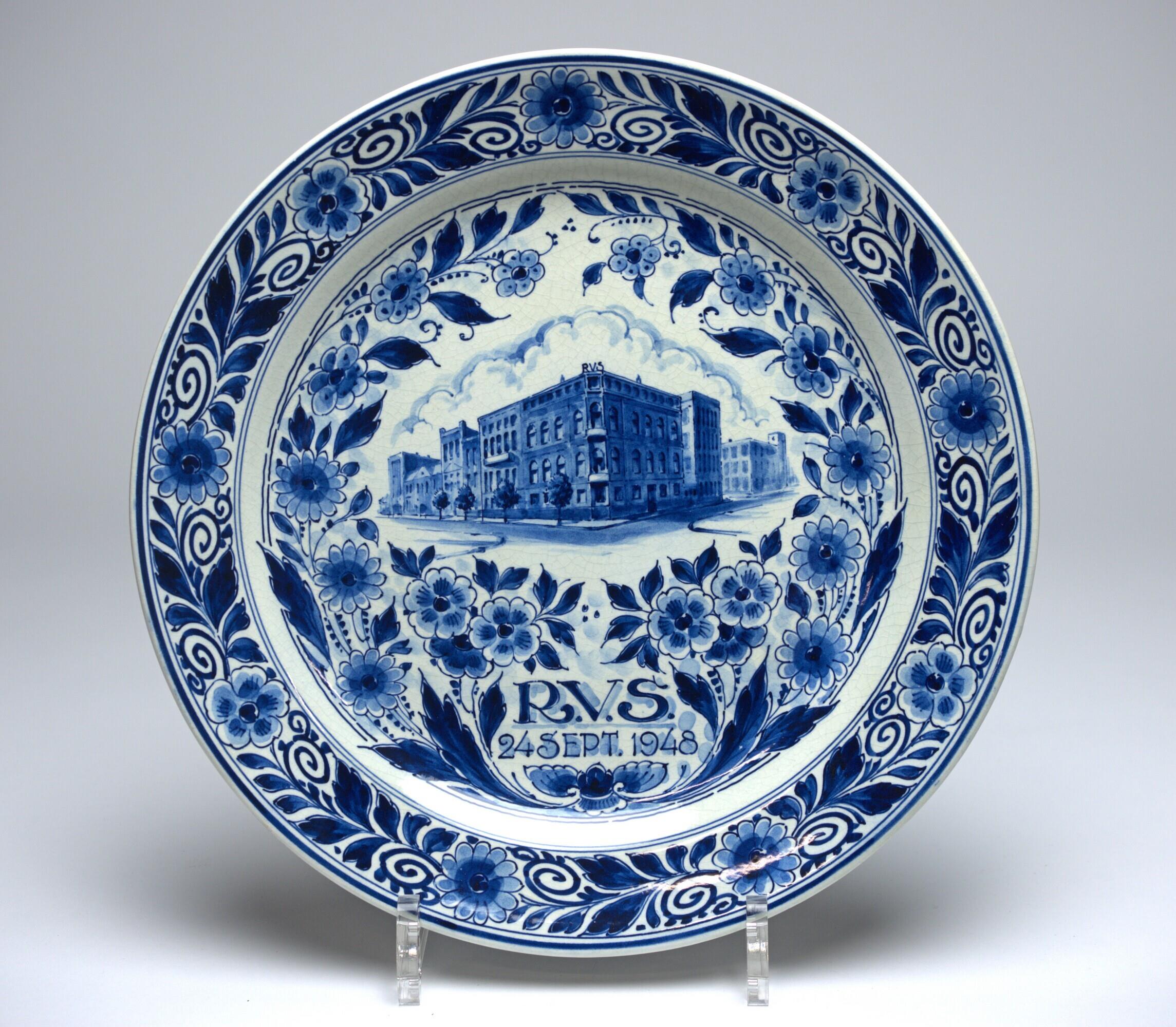 Gedenkbord van de Rotterdamse Verzekerings Sociëteit met afgebeeld het oude kantoorgebouw van de R.V.S., omgeven door een randdecoratie van bloem- en bladwerk en opschrift R.V.S. en 24 september 1949. (Nederlands)