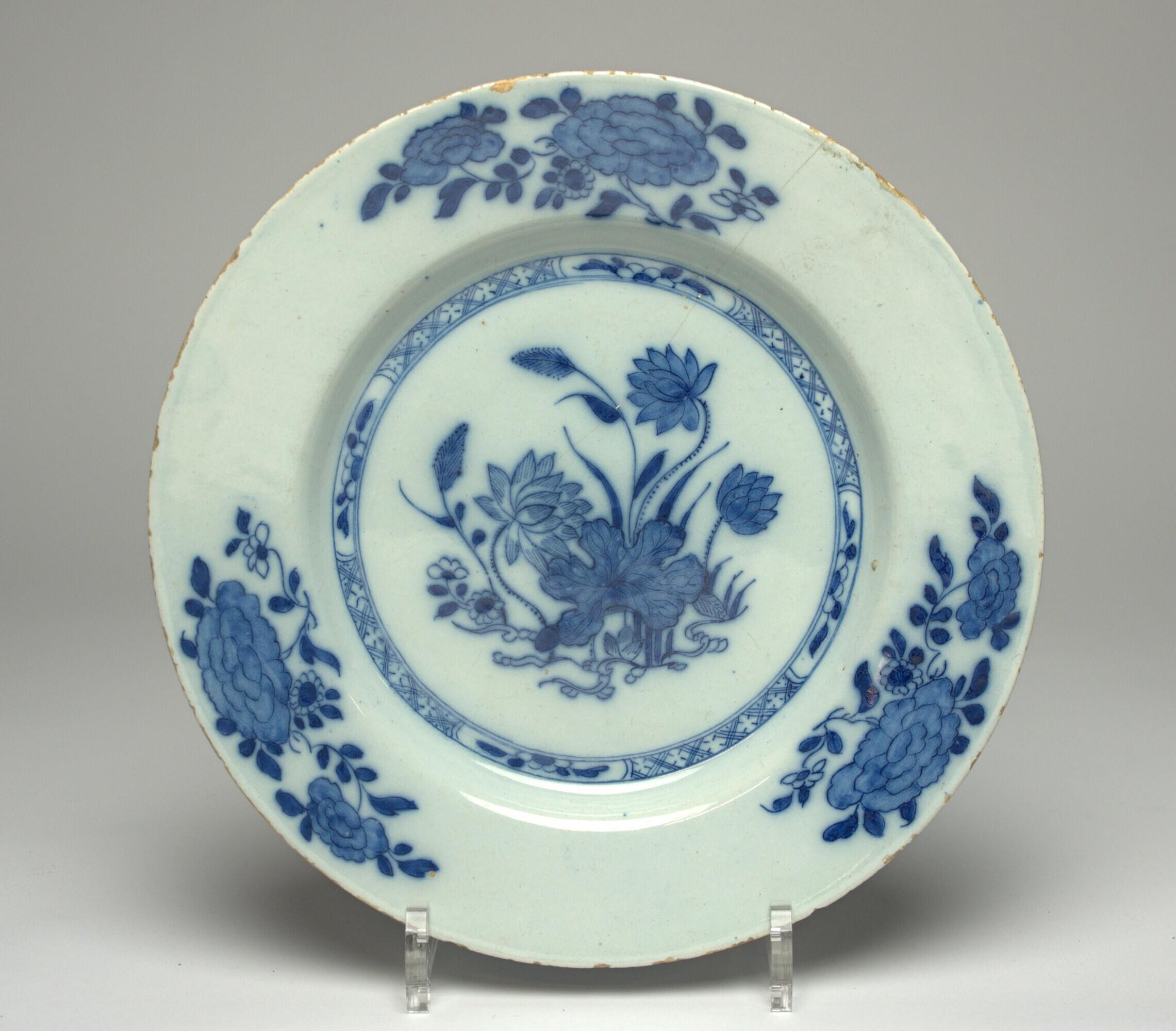 Het met lage standring uitgevoerde bord is aan de voorkant in het plat beschilderd met bloemen op een grondje omgeven door een band van servetwerk met drie kleine cartouches. Op de rand zijn drie bloemtoeven. (Nederlands)