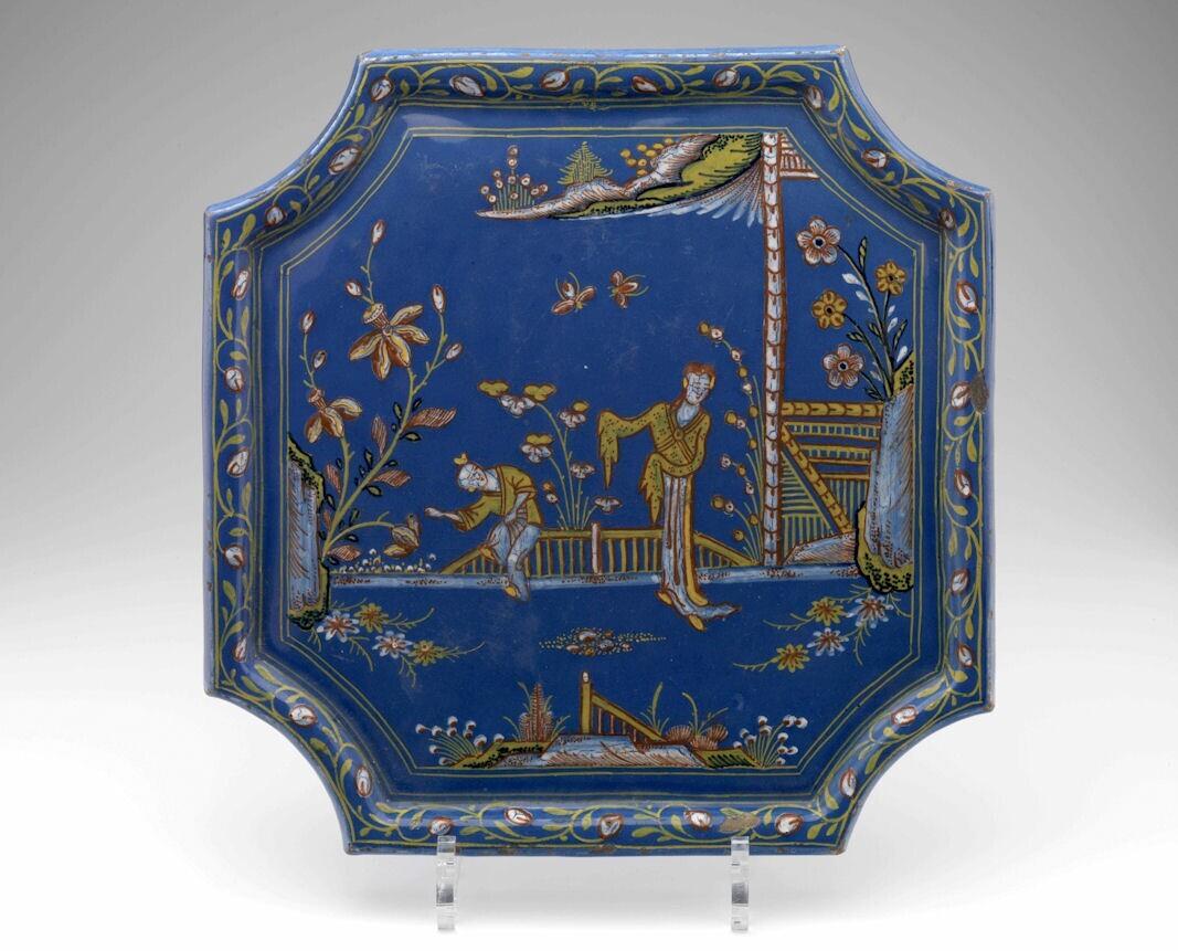 Rechthoekige dienblad met geschulpte hoeken rustend op vier bolpootjes met opstaande rand gedecoreerd met bloemslinger. Het dienblad heeft een zogenoemde Nevers-blauwe of 'berettino' ondergrond waarin een polychrome chinoiserie decoratie is aangebracht van een staande dame met links een dansend zotje en rechts een bamboe veranda. (Nederlands)