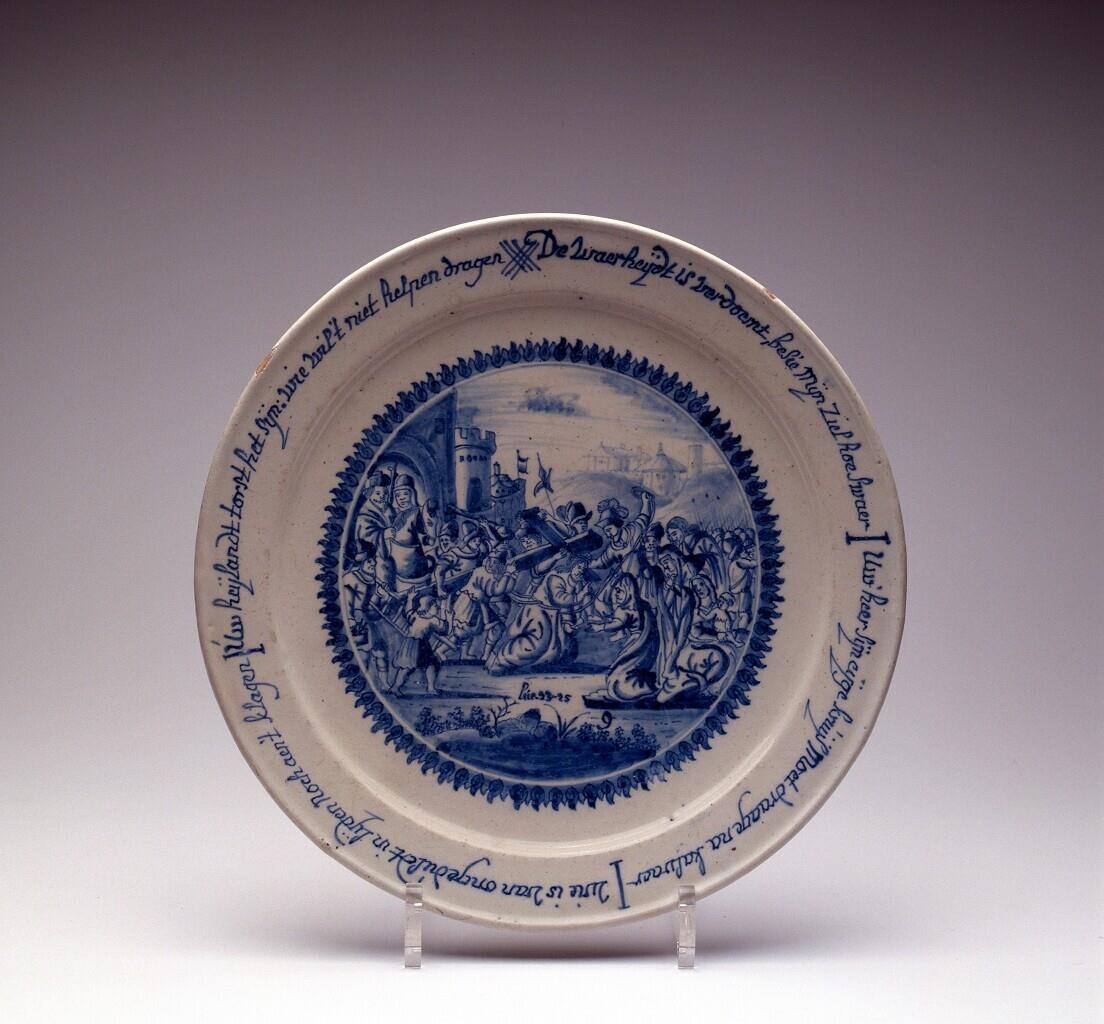 De achterkant van het zonder standring uitgevoerde bord loopt een weinig rond en heeft een vlak middendeel. Op de voorkant is voor de centrale voorstelling gekozen voor een episode uit de Kruisweg van Christus: Christus valt temidden van een menigte voor een stadspoort, waaronder een knielende Veronica, onder het kruis. Op de rand het opschrift:'De waerheijdt is verdoemt, besie mijn ziel hoe swaer Uw heer sijn eijge kruijs moet draage na kalvaer Wie is van ongeduldt in lijden noch aen't klagen Uw heijlandt torst het sijn: wie wil 't niet helpen dragen'. In het plat Luc 23-25; 9 (Nederlands)
