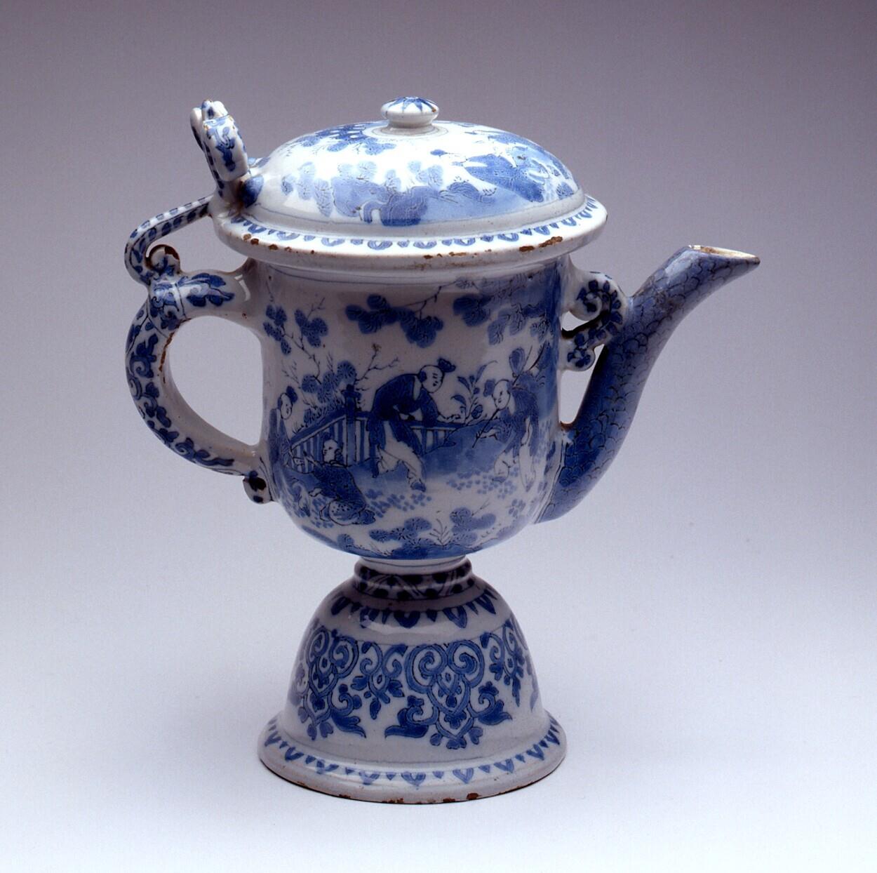 De bekervormige kan, een zogenaamde fopkan, heeft een oorvormig handvat en een licht gebogen tuit met schubben. Het handvat is verbonden met de vaste, bolle deksel door een voluutvormig duimstuk. Het deksel vormt een geheel met de bekervormige kan, zodat het alleen via de bodem gevuld kan worden. Het geheel staat op een klokvormig voetstuk dat aan de binnenkant voorzien is van een kruis bestaande uit twee S-vormige motieven. De kan zelf is beschilderd met chinoiserie voorstellingen. Eén zijde toont vier Chinese figuren in een omheind tuinachtig landschap. De andere zijde toont drie Chinese figuren bij een boom in een landschap met een rotspartij rechts in de achtergrond. Het deksel is op dezelfde wijze versierd met drie Chinese figuren bij een rotspartij. Op de rand van het deksel is een band van puntig afhangend blad geschilderd. Hetzelfde motief komt terug op de voet, gescheiden van de rest door een band van alternerende lambrequins en ranken. De overgang van de voet naar de beker wordt gemarkeerd door servetwerk. (Nederlands)