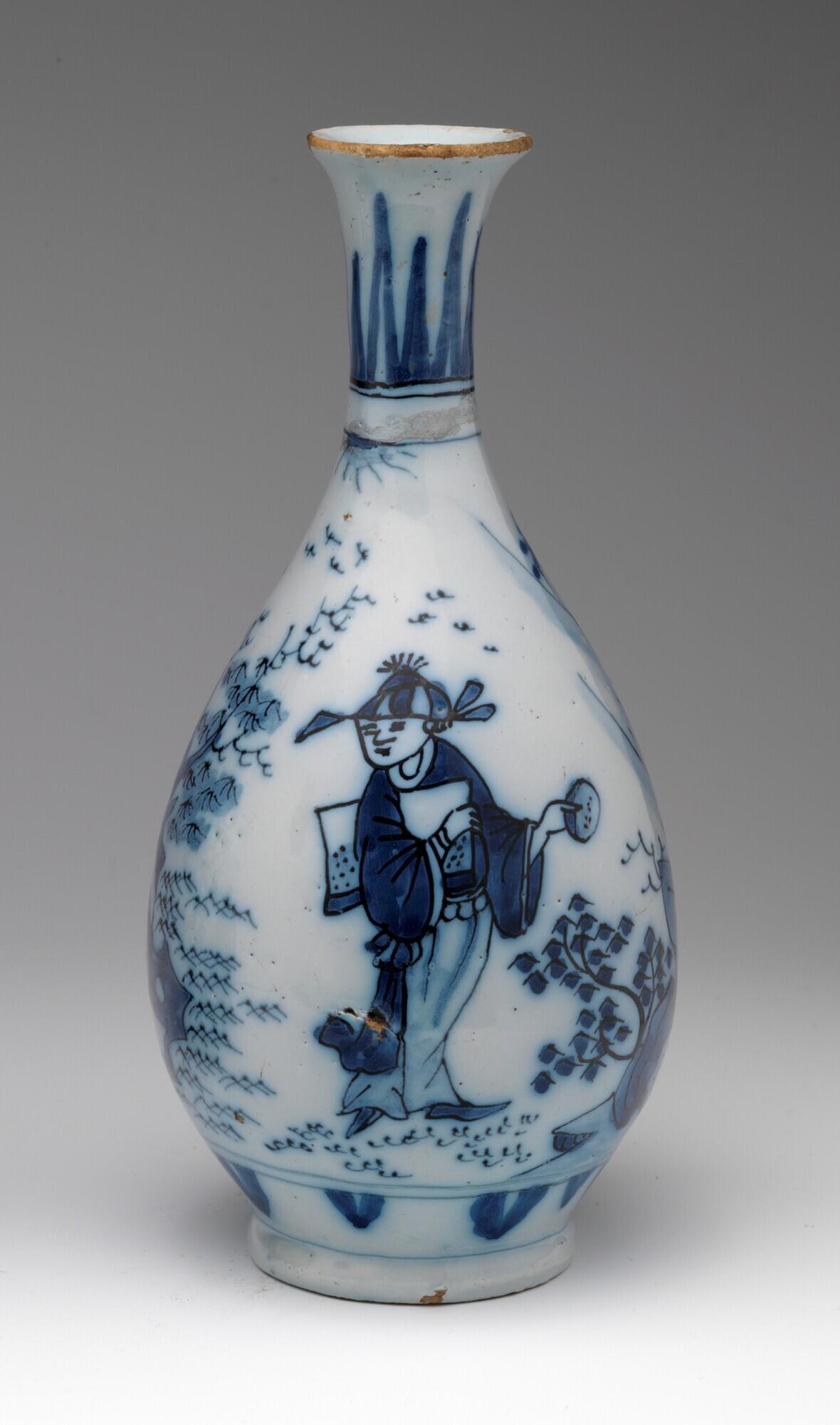 Peervormige vaas met trompetvormige hals, met een afbeelding van een rotslandschap met drie, aan een lage tafel zittende Chinezen, waarvan één een object omhoog houdt en een ander iets van de tafel pakt. Een vierde Chinees staat met boek onder de arm aan de andere zijde. Op de hals een fries van gestileerde, smalle puntige bladeren. Op de voet van de vaas zijn hangende tongen afgebeeld. (Nederlands)