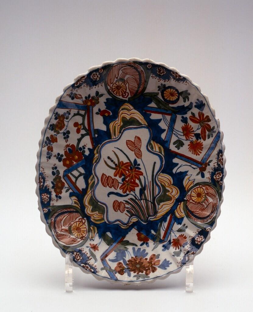 Het ovale geribde schoteltje is aan de achterkant voorzien van een standring. Aan de voorkant toont de decoratie het vaak op Delfts aardewerk afgebeelde chinoiserie decor van het bliksemmotief in combinatie met gestileerde wolken, bloesemtakken en cartouches met bloemen en bladeren. Mogelijk is dit decor afgeleid van een Japanse Imari-voorstelling met hekwerk of kronkelende twijgen. Kleuren: blauw, groen, geel, rood en mangaan. (Nederlands)