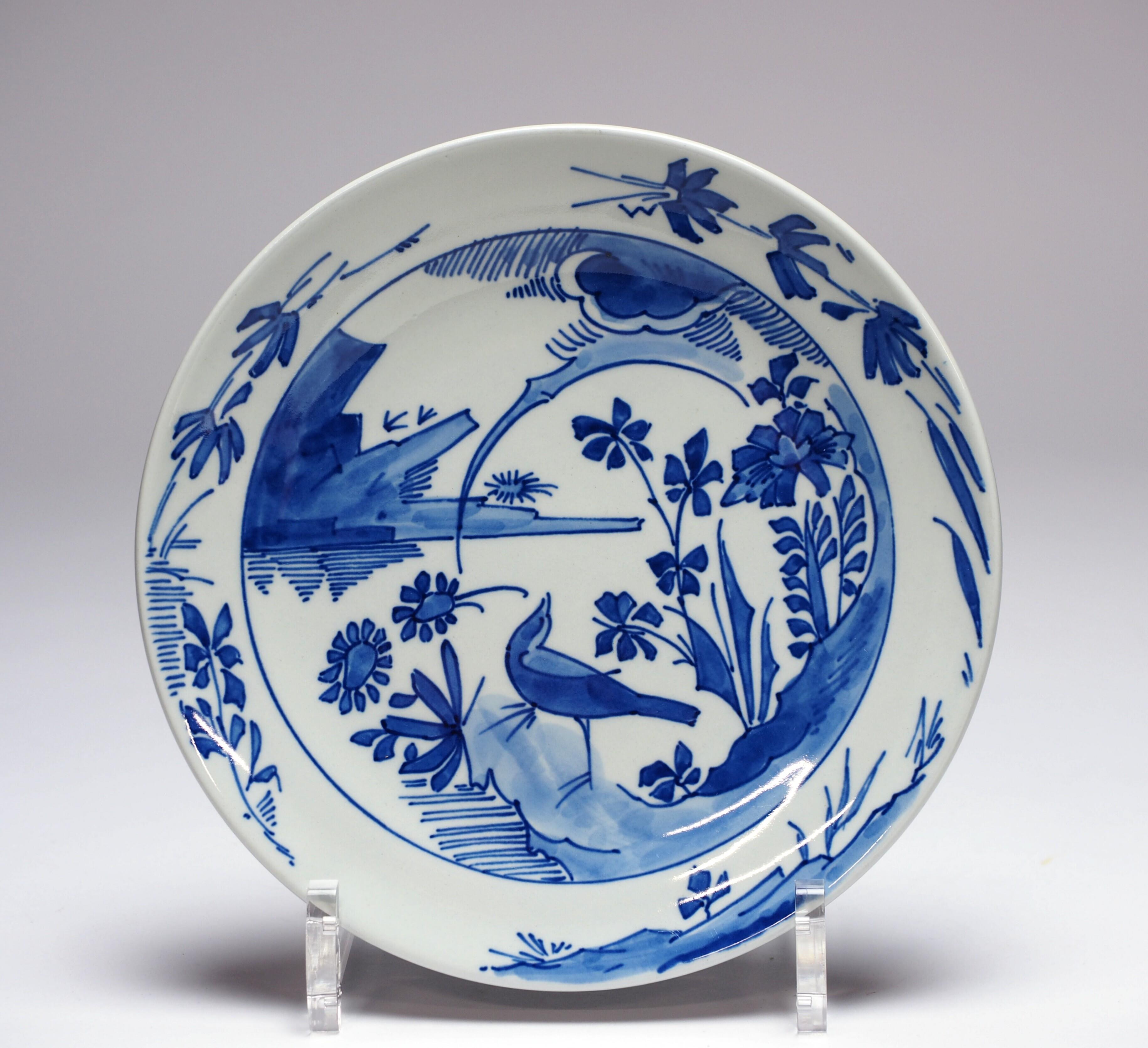 Bord, met standring, aan de voorkant gedecoreerd met een vogel op een soort rots met bloemen, geïnspireerd op 17de eeuwse in Kraakstijl uitgevoerde voorbeelden. Randdecoratie van oosters aandoende takken en twee concentrische ringen aan de achterkant. (Nederlands)