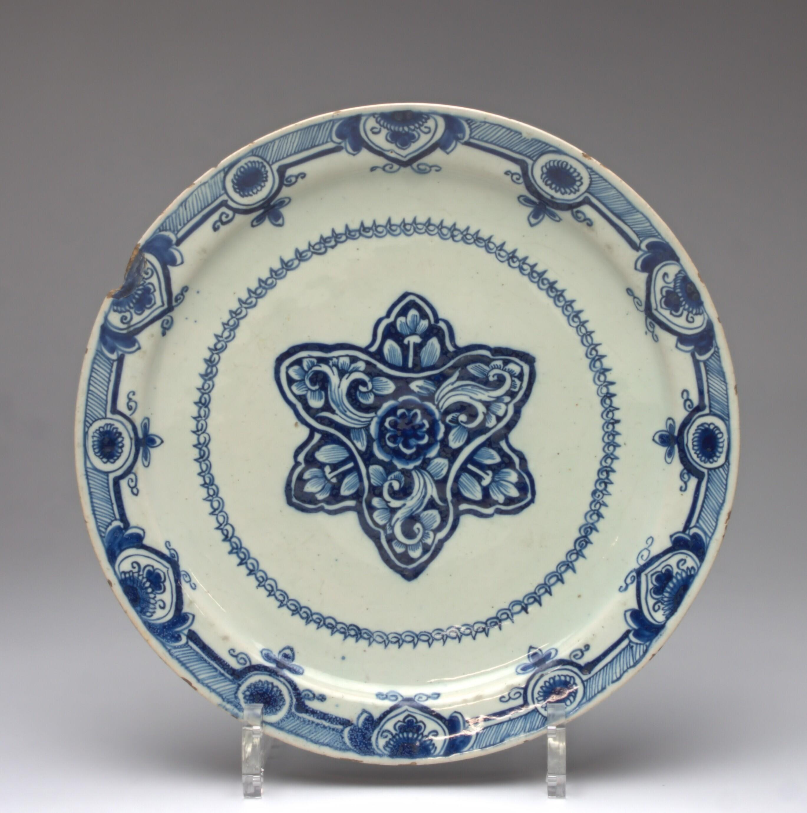 De achterkant van het zonder standring uitgevoerde bord, loopt een weinig rond en heeft een vlak middendeel. Op de voorkant bestaat de centrale voorstelling uit twee over elkaar geplaatste driehoekige motieven die in de spaartechniek zijn versierd met bladeren, omcirkeld door een strakke, naar buiten gerichte puntige spiraalband. De randdecoratie bestaat uit gestileerde florale motieven gescheiden door een gearceerde band. (Nederlands)