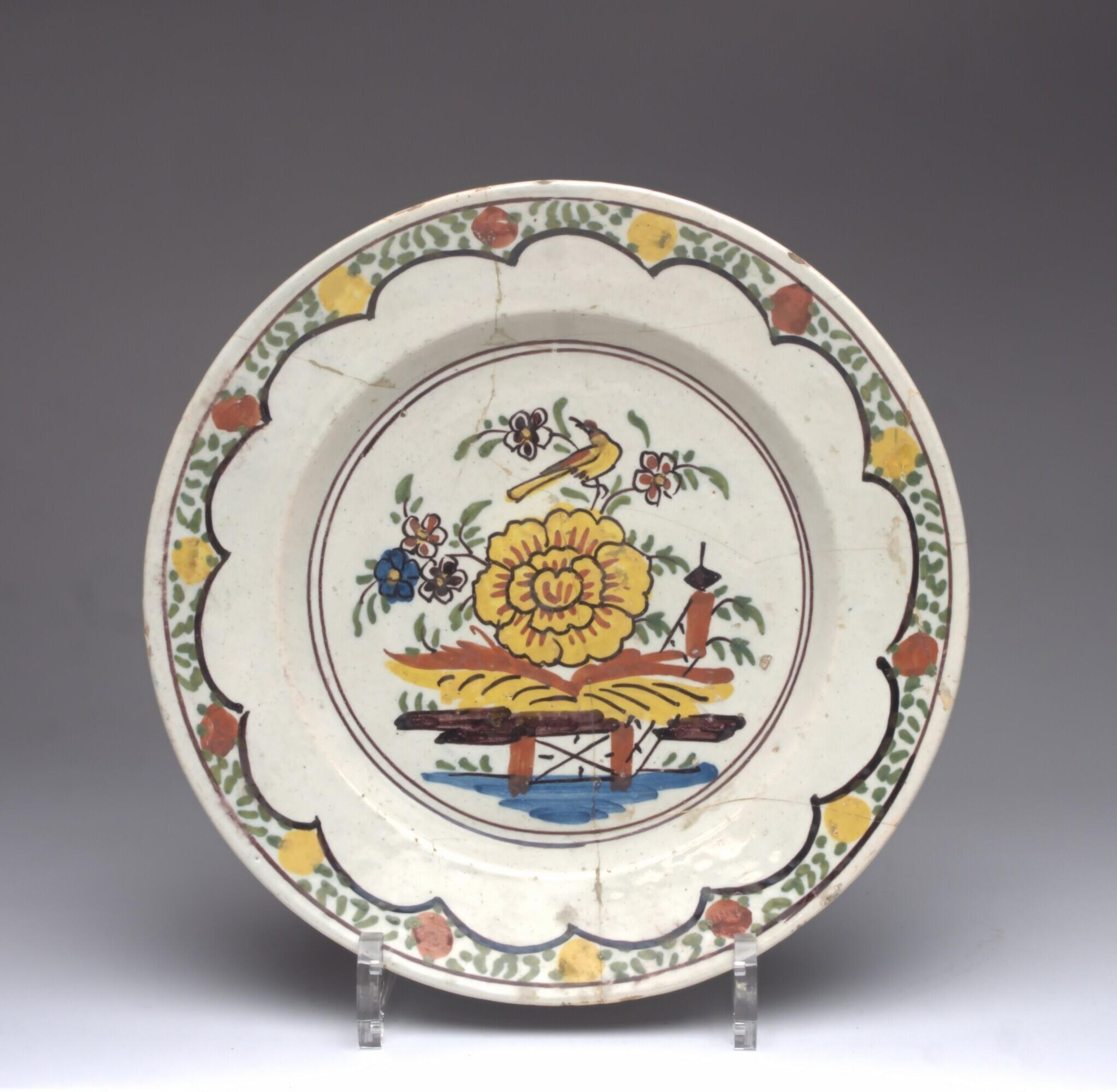 Rond bord; op het plat, in een cirkellijst, een grote gele bloem op een gespreid blad aangevuld met bloesemtakken; op één ervan een gele vogel; het geheel rust op een tafeltje; op de rand een groen gespikkelde band waarin afwisselend rode en gele bessen, met golvende binnenrand; (Nederlands)